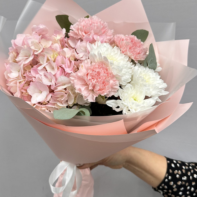 Диантус (нежно-розовый) — 3, гортензия — 1, хризантема кустовая балтика — 1, эвкалипт — 1, упаковка — 2, лента атласная — 1